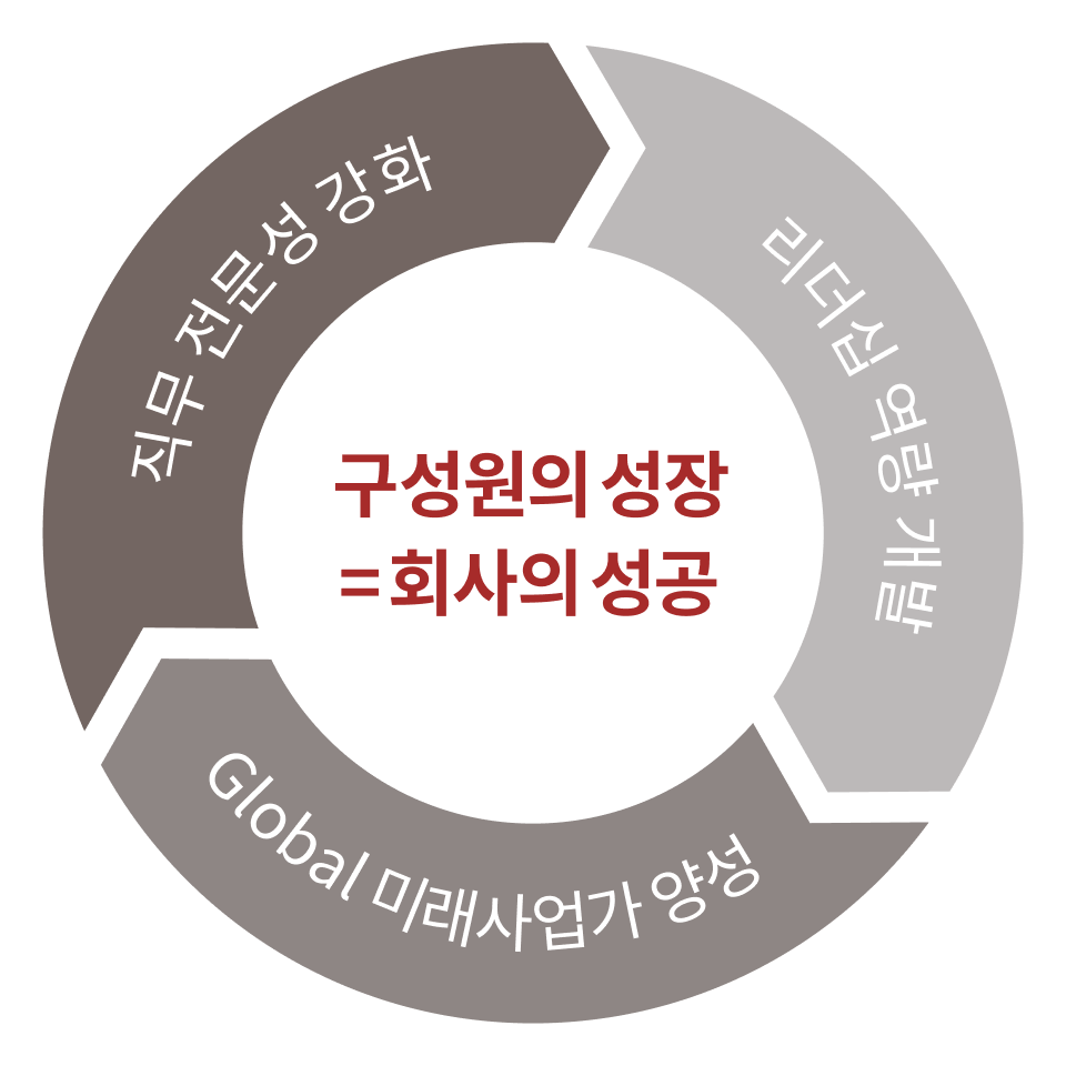 이를 위해 '리더십 역량 개발', '직무 전문성 강화', 'Global 미래사업가 양성' 등을 목표로 중점적으로 구성원을 육성합니다.